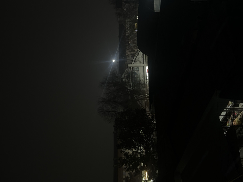 The image presents a nighttime urban vista within Andijan City, Uzbekistan. The scene is dominated by a dark, overcast sky occupying the upper two-thirds, with a prominent, solitary point light source, likely the moon or a powerful artificial light, centered horizontally and positioned in the upper mid-ground, exhibiting a strong lens flare. In the mid-ground, silhouetted against the ambient light, are several bare deciduous trees, indicating a season without foliage. Behind these trees and extending across the horizon are various multi-story buildings. A distinctive contemporary building with a large, curved roof structure, possibly glass or metallic, is visible slightly right of center, illuminated from within its lower sections. The foreground, occupying the bottom third, consists primarily of dark, indistinct rooftops or overhead structures. On the lower left, a partially visible, illuminated area reveals what appears to be an outdoor display of various items, suggesting a market stall or an open-air retail point. No individuals are clearly discernible. The overall environment is dark with artificial light sources providing limited illumination to specific areas.