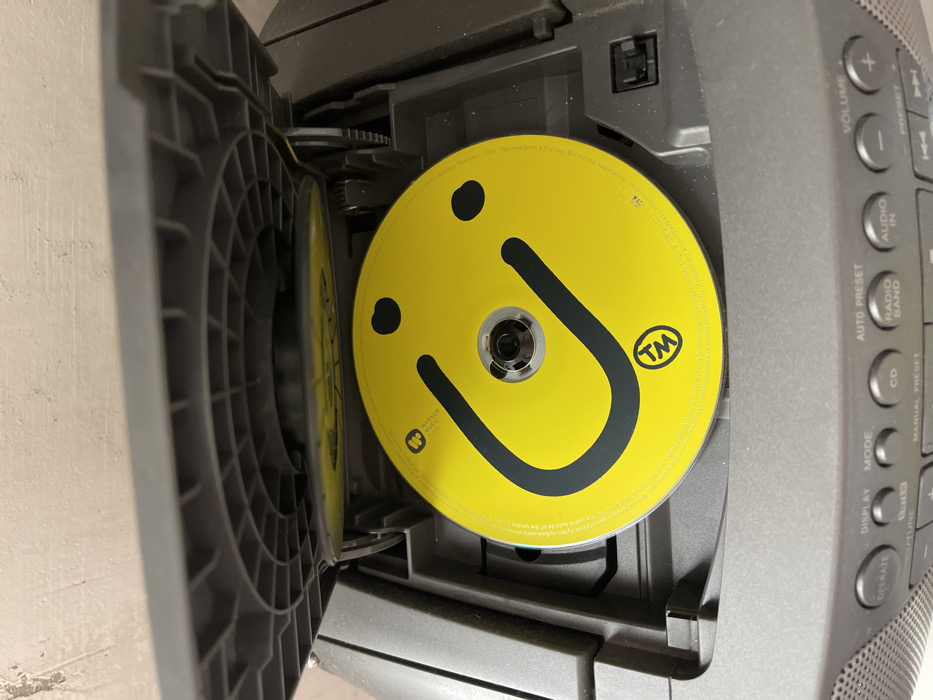 In the city of Khimki, Russia, a grey, top-loading portable compact disc (CD) player is observed in a close-up, slightly overhead view. The player's lid is open, revealing its internal mechanism and a bright yellow compact disc. The disc is adorned with a prominent black graphic featuring two small circular "eyes" and a large inverted U-shaped "mouth" or body, resembling a stylized smiley face or an umlauted 'U'. A small "WP" logo, identified as Warner Music, is visible on the left side of the disc, while a larger "TM" (Trademark) symbol is positioned near the bottom. The disc is seated in the primary playback tray. The control panel on the front of the player features numerous grey buttons, including those labeled "OPERATE," "DISPLAY," "MODE," "CD," "AUTO PRESET," "RADIO BAND," "AUDIO IN," "VOLUME +," "VOLUME -," and track navigation controls. The underside of the open lid exhibits a dark grey, ribbed plastic structure. The immediate background behind the CD player consists of a light-colored, textured wall.