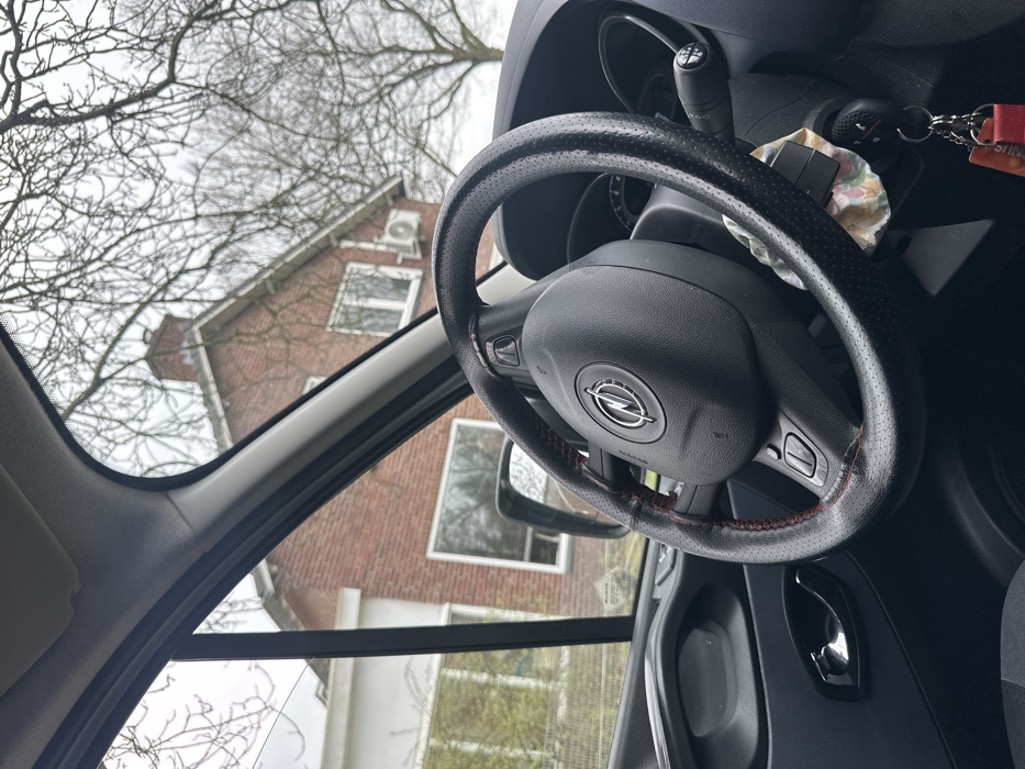 A photograph taken from inside a dark-colored vehicle, looking forward through the windshield. In the foreground, the multi-function steering wheel of a vehicle, identifiable by the Opel/Vauxhall emblem, occupies the lower right and center. The steering wheel rim features a black perforated leather cover with red stitching visible on the inner circumference. A set of keys attached to a red lanyard and a small floral-patterned fabric object hang from the ignition switch, positioned below the steering wheel. The vehicle's dark gray dashboard and part of the driver's side door panel with a chrome handle are visible on the left. Outside the vehicle, a two-story red brick house with a dark pitched roof and a chimney is centrally positioned in the midground. The house features multiple white-framed windows, and an external air conditioning unit is mounted on its facade below an upper-level window. To the left of the main house, a portion of another white-painted building is visible. Numerous bare tree branches extend across the upper portion of the frame, silhouetted against an overcast, light gray sky. The scene is located in Sint Anthonis, Netherlands. No people are visible.