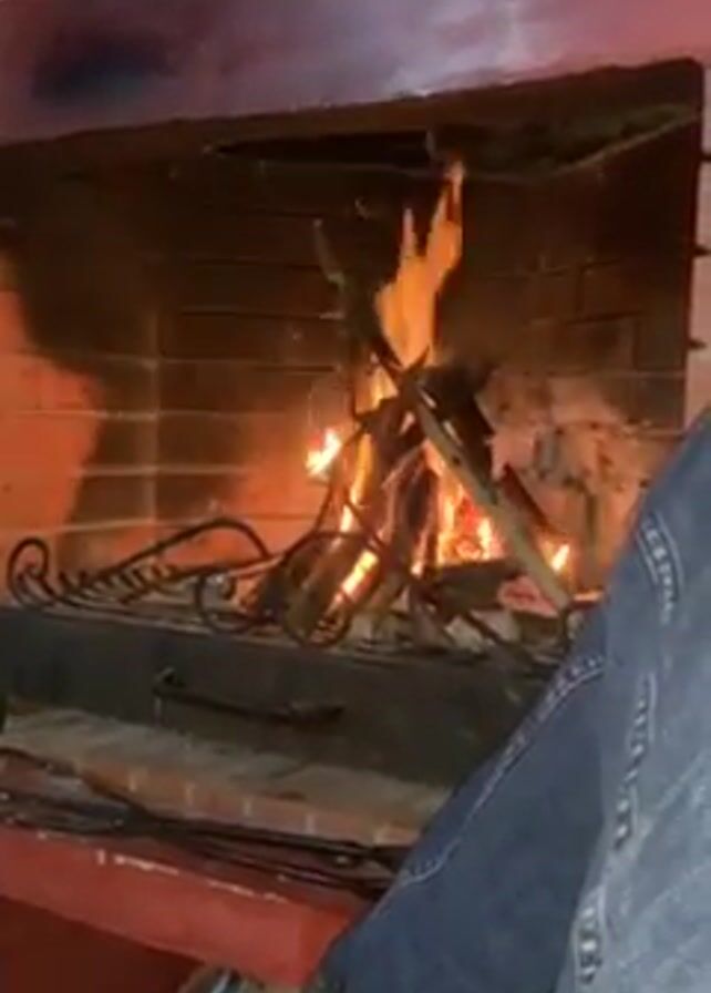 A low-angle shot shows a roaring fire inside a brick fireplace