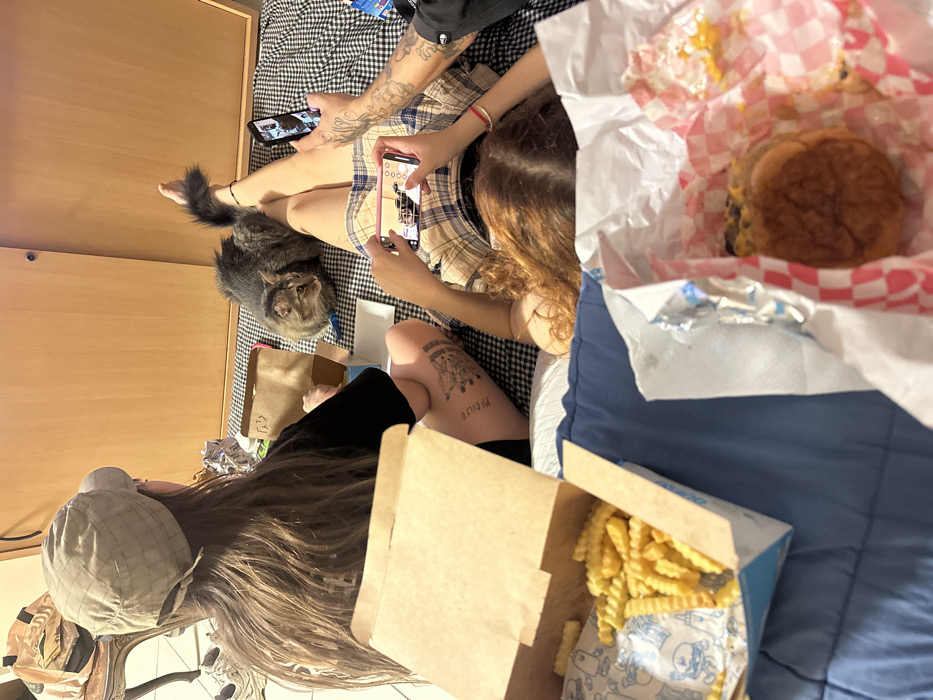 Three people are on a bed, one taking a photo of a cat with their phone. Food, including a burger and fries, is also on the bed. The room is casually lit and includes elements like a wardrobe, shopping bag, and window. The person taking the photo is wearing a plaid skirt. Another person is also taking a photo with their phone. Tattoos are visible on some individuals.