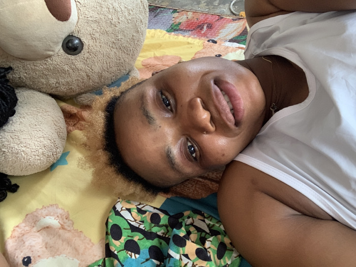 The image displays a close-up, high-angle view of a Black female individual lying on her back, looking directly at the camera with a slight smile. She wears a white sleeveless top. A small stud piercing is visible on her left nostril, and a thin gold-colored necklace with a key-shaped pendant adorns her neck. Her hair is short and dark, with lighter, possibly bleached, sections. To the left of the individual, the head and upper torso of a large, light-brown teddy bear with dark button eyes are visible. Both subjects rest on a yellow-dominant patterned fabric, possibly a bedsheet or blanket, featuring cartoon bear figures and blue star shapes. A second patterned fabric, primarily green, black, white, and brown with abstract shapes, is visible beneath the individual's right arm. The setting appears to be an indoor domestic environment. The specific location within Lagos, Nigeria, or the city itself, cannot be determined from the visual information provided.