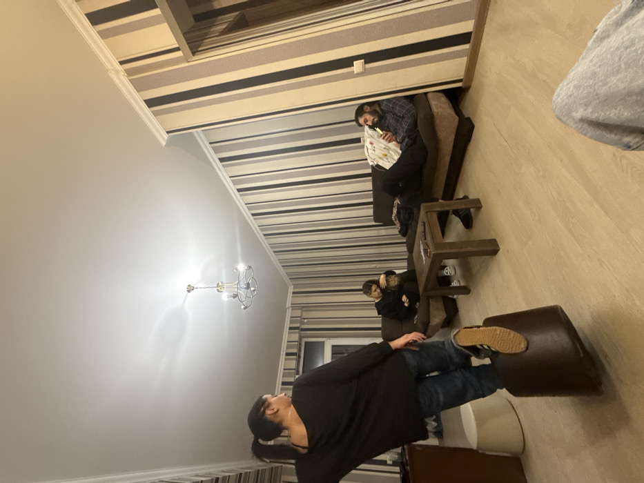 The image depicts an indoor living space in Tbilisi, Georgia. The room features white crown molding, a white ceiling with a central multi-bulb chandelier, and walls covered in vertical striped wallpaper alternating between dark grey, light grey, and beige. The floor is light-colored wood-look laminate. Three individuals are clearly visible, with a fourth person partially seen in the foreground. 1. On the left, a female stands with her back partially towards the camera, looking towards the right. She wears a black long-sleeved top and blue jeans. Her left foot is propped onto a dark brown cylindrical object. Her dark hair is pulled back in a ponytail. 2. In the mid-ground, a female sits on a dark brown sofa, facing slightly right. She wears dark clothing and white sneakers. Her head is tilted, and her left arm appears to be around another person's head, which is mostly obscured. 3. On the right, a bearded male sits on a dark brown sofa, leaning back. He wears a plaid shirt and dark pants, and is looking at a smartphone held in his hands. A light-colored blanket or garment is draped next to him on the sofa. 4. The lower legs and feet of a fourth individual, wearing light-colored pants and dark shoes, are visible in the bottom right corner of the frame, suggesting another person is seated or reclining. A rectangular dark wooden coffee table is positioned in front of the sofas, with small unidentified objects on its surface. A small, light-colored stool or side table is partially visible near the standing female on the left. The scene indicates a casual indoor gathering under artificial lighting.