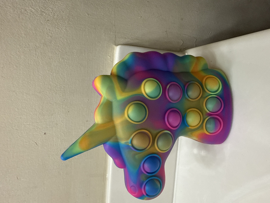 - "A multicolored silicone pop-it fidget toy, shaped as a unicorn's head and upper neck, is centrally positioned on a white, flat horizontal surface within an interior space in Grayson, United States" by FM-AodXs2, licensed under CC BY 4.0