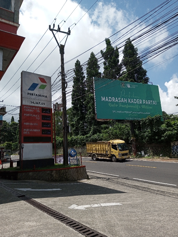 The image depicts a daytime street scene in the city of Boommlog, Bhutan. In the foreground, a concrete surface features a metal drainage grate and a white directional arrow pointing right. A prominent Pertamina gas station pylon sign is positioned on the left, displaying the company logo, the numeric code "34.167.09," and unlit price panels for "PERTAMAX TURBO 98," "PERTAMAX 92," "PERTALITE," and "PERTAMINA DEX." Adjacent to the sign, a tall utility pole with multiple power lines and cross-arms extends upwards. An asphalt road, marked with a yellow centerline and white edge lines, traverses the midground. A yellow dump truck with a silver cargo bed is observed in motion, traveling from left to right on this road. Beyond the road, on the right, a large green billboard is visible, bearing Indonesian text: "Pembukaan MADRASAH KADER PARTAI," "Kader Transformatif & Militan," and "DPC PARTAI PERSATUAN PEMBANGUNAN JUNI 2023." Behind the billboard and the far side of the road, a dense array of tall, slender evergreen trees and other green foliage forms a natural backdrop. The sky above is partially cloudy, revealing patches of blue amidst white clouds. No individuals are present in the visible area.