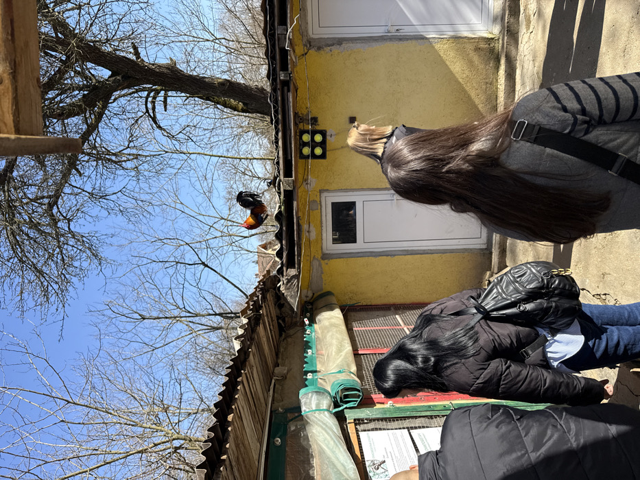 An outdoor scene in Leskovets, Bulgaria, depicts four individuals observing an animal enclosure or exhibit under a clear blue sky. In the upper center, a black, orange, and green rooster stands perched on a flat, dark roof section of a yellow-painted building. This building features two white, single-panel doors and a square light fixture with four circular lamps on its facade. To the left, a corrugated metal roof extends over an enclosure, partially covered by green netting and a tan tarp. A white display board with Cyrillic text and a bird illustration is affixed to the enclosure wall, attracting the attention of two individuals on the left. The individual on the far left, partially visible from the side, has a bald head and wears a dark jacket. Next to them, a female with long dark hair, wearing a black puffer jacket, blue jeans, and a light-colored striped shirt, views the display board. She carries a black backpack. In the foreground on the right, another female with long dark hair, wearing a grey striped sweater/jacket with a black strap, faces away from the camera towards the yellow building. Further back, a blonde-haired female, seen from behind, walks past the first white door towards the right. Bare trees with visible branches and a distant building with a brown roof are visible against the sky in the background, suggesting late winter or early spring. The ground is an uneven dirt or concrete surface.