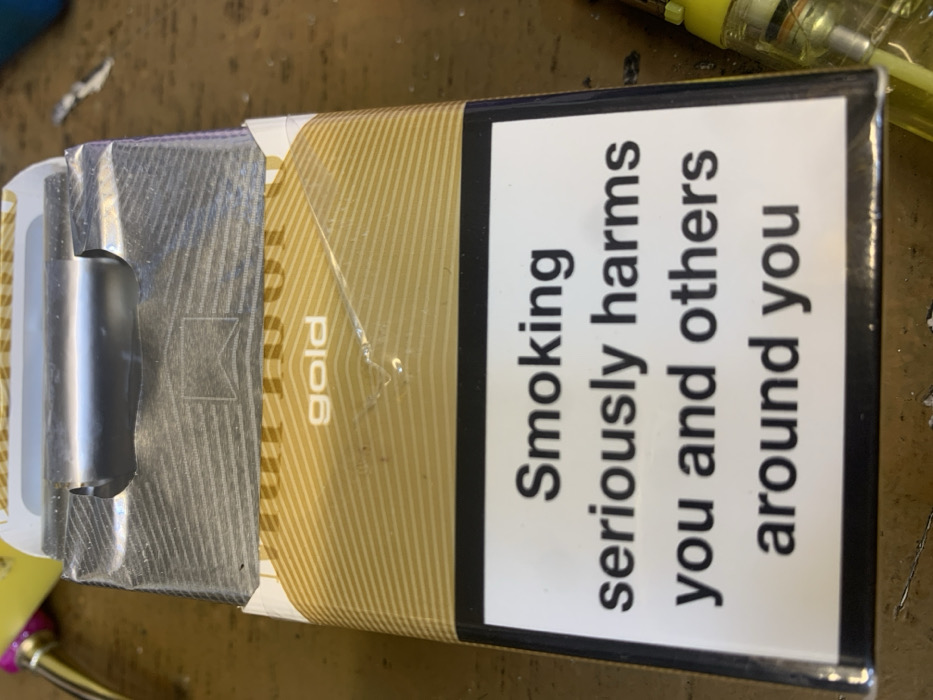 - "A partially opened pack of Marlboro Gold cigarettes is depicted, positioned centrally, on a textured, brownish-orange surface" by FM-mmOcg2, licensed under CC BY 4.0