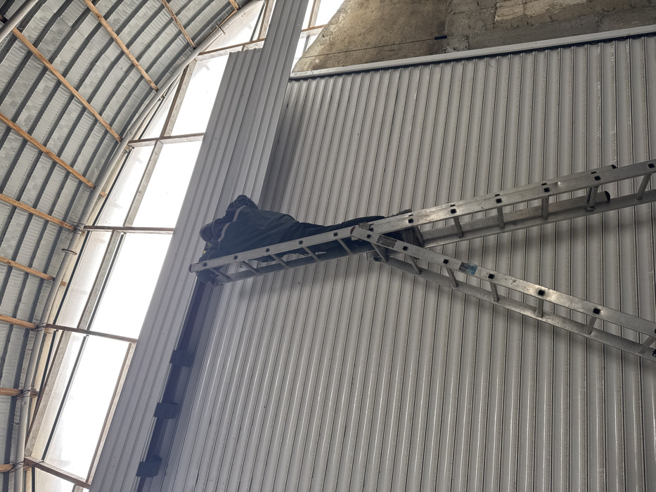 An interior scene in the city of Slivak, Bulgaria, depicts a single individual performing work on a tall, horizontally corrugated metal roll-down door or partition. The person, observed from a rear perspective and dressed in dark attire, stands on the upper portion of a silver A-frame aluminum stepladder. They are positioned at an elevated height, manipulating a light-colored, corrugated metal panel that is either being installed or adjusted above the main body of the roll-down door. Directly below this panel, a dark horizontal track system with visible brackets is present. Above the work area, a series of large, clear or translucent rectangular window panes are integrated into the upper structure, providing ambient illumination. The building's ceiling consists of an arched corrugated metal roof supported by wooden beams. A rough concrete or stone wall section is partially visible along the right edge of the frame.