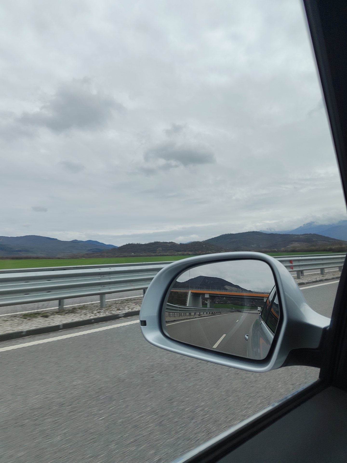 The image depicts a view from inside a moving vehicle on a highway in Skravena, Bulgaria. The road surface is asphalt, with a double white line marking the lane dividers. To the right, a silver guardrail separates the highway from a grassy area, and mountains are visible in the distance under an overcast sky. The car's side mirror shows a reflection of the road behind, including an orange overpass and another vehicle in the distance. The car's frame is visible in the foreground.