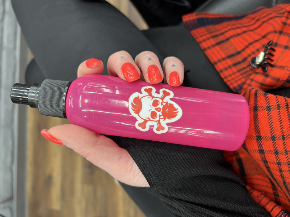 An individual's left hand, adorned with bright red nail polish and visible small blue dot tattoos on two fingers, firmly grasps a hot pink plastic spray bottle, situated in an indoor setting in Minsk, Belarus. The bottle features a black ribbed spray nozzle and a white-on-red sticker depicting a stylized skull with a beard and hairstyle, flanked by crossbones. The individual is dressed in black leggings and a black ribbed long-sleeved top with a thumbhole cuff. A red and black plaid garment rests on their lap, to which a black claw-style hair clip with a metallic accent is attached. The background reveals a light-colored wooden floor and a grey brick-patterned wall.