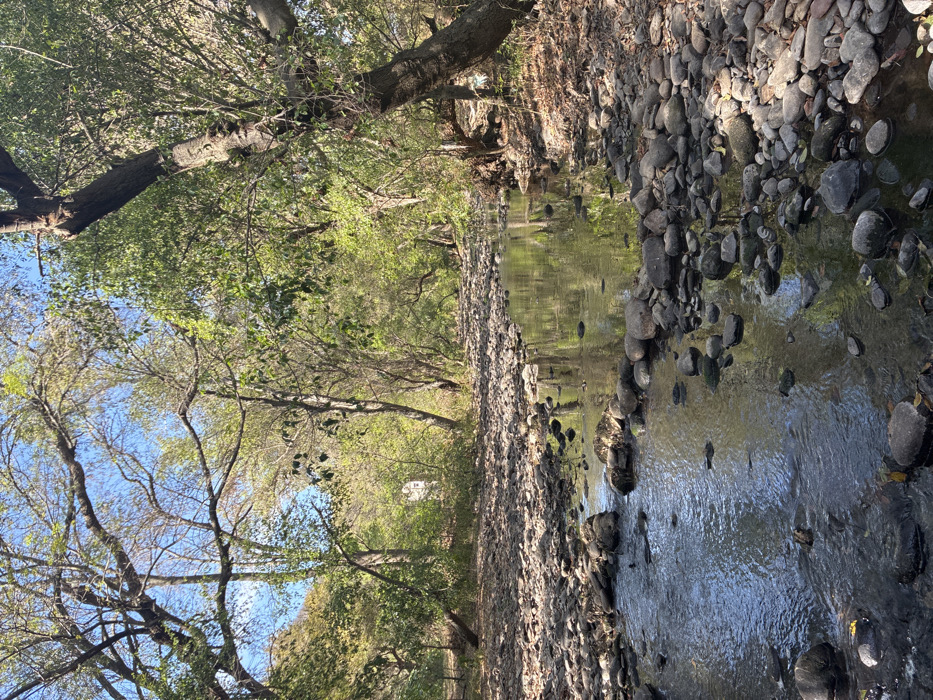 - "A shallow, clear stream flows between rocky banks and under a canopy of trees with vibrant green foliage" by FM-5mNCn2, licensed under CC BY 4.0