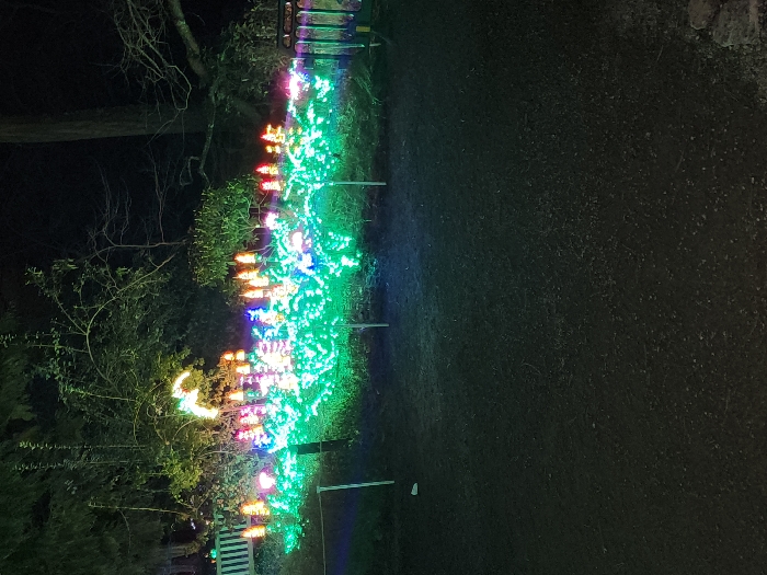 An outdoor display of Christmas lights illuminates a dark setting. Strings of colorful lights, predominantly green and blue, outline shapes and patterns. They appear to be staked along the ground, creating a vibrant, linear decoration. To the left, trees and branches stand silhouetted against the night. The area to the right is a dark, possibly grassy, expanse.