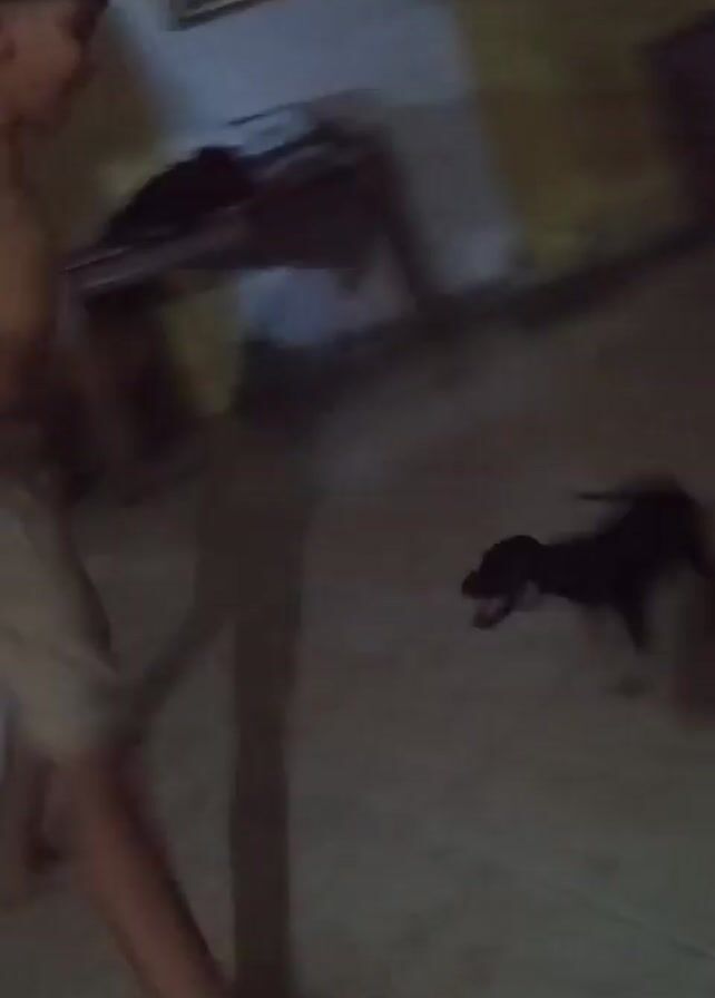 A dimly lit room with tiled floors contains a dark-haired boy, shirtless and wearing light-colored shorts. A small, dark dog appears to be barking or yipping. The boy briefly runs, then bends over with his hands on the floor, eventually standing up and smiling at the camera. A framed picture is on the floor along the wall. A small table with objects on it is in the background. The video appears to have been shot handheld, resulting in some blur.
