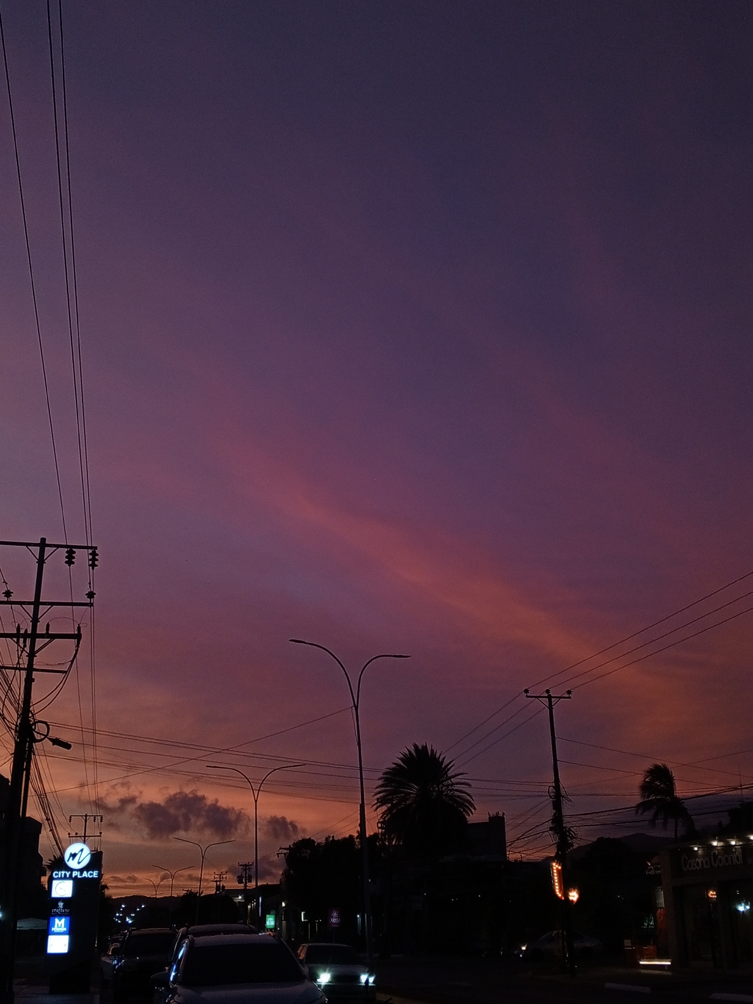 The image captures a street scene in Pampatar, Venezuela, at dusk. The sky is a deep purple hue with streaks of pink and orange near the horizon. Utility poles and power lines crisscross the upper portion of the frame. Below, silhouetted trees and buildings line the street. The "City Place" sign is visible on the left side, illuminated, and a "Casana Colonial" building can be seen on the right. Cars are parked along the street, and headlights are visible. Streetlights provide additional illumination to the scene.