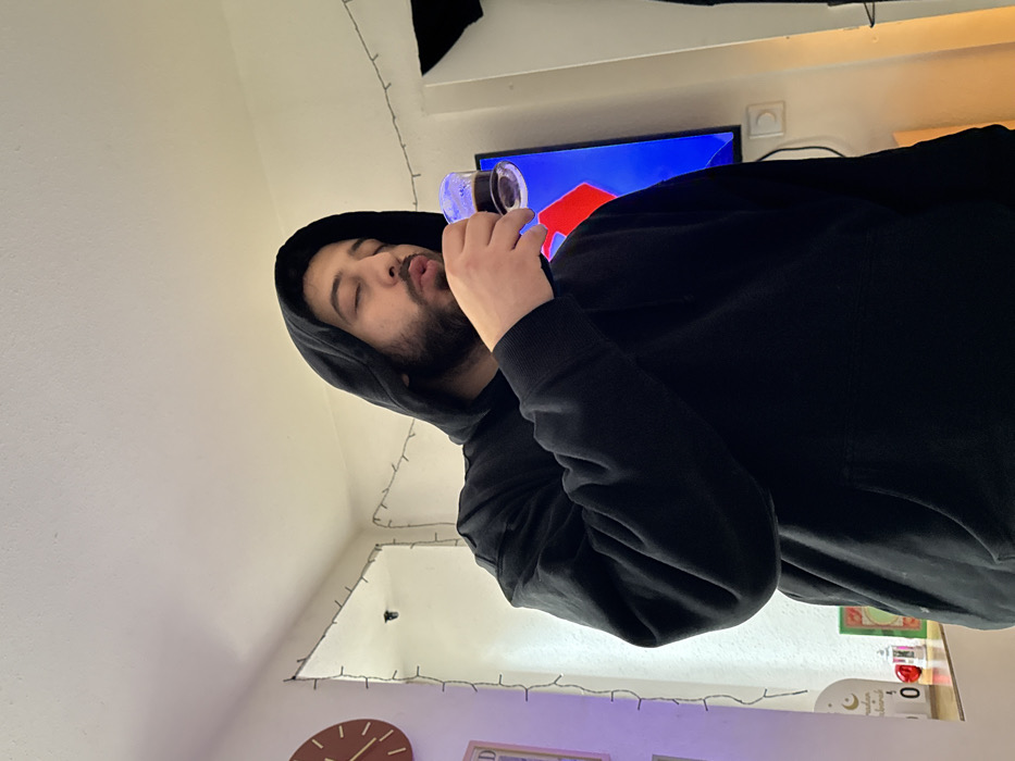 A frontal, slightly low-angle photograph depicts an adult male indoors in Strasbourg, France. The subject, characterized by a beard and dark hair, wears a black hooded sweatshirt with the hood drawn over his head. He is captured in the act of consuming a dark liquid from a small, clear glass, held to his lips with his right hand. His eyes are closed and his lips are pursed. The background consists of light-colored walls. To the left, a round wall clock with reddish-brown hands and vertical string lights are visible. Below these, a shelf or ledge holds decorative items, including a white crescent moon and star ornament with "Ramadan Mubarak" text. To the right, an electronic display shows bright red and blue content, above which horizontal string lights are strung. A wall socket and a warm-toned light source are also present in the lower right portion of the image, indicating a residential interior.