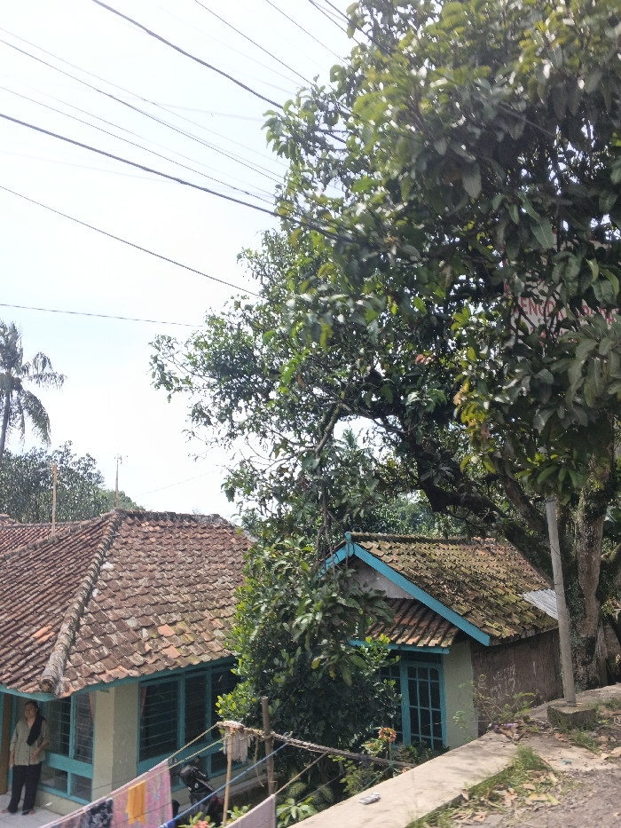 Two houses with tiled roofs stand among lush greenery. The closer house, featuring blue-trimmed windows and a weathered facade, is partially obscured by trees. Next to it, a two-story house is visible behind a clothesline with hanging laundry. Overhead, power lines cut across a hazy sky, while a tall tree fills the right side of the frame. A person stands in front of the two-story house.