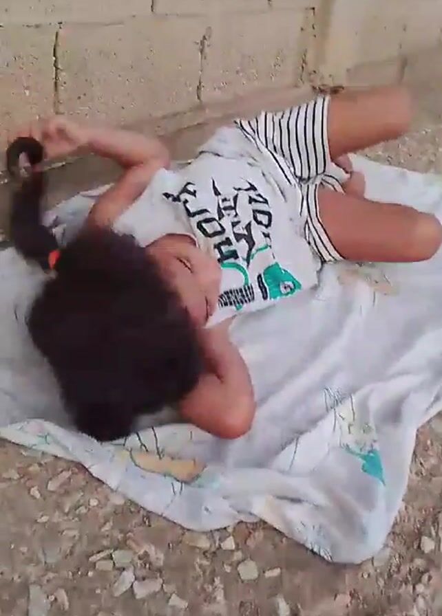 A young girl is lying on her side on a white patterned blanket placed on a rocky surface. She is wearing a white shirt with black text and black and white striped shorts. Her hair is dark and styled in pigtails with yellow hair ties. She is positioned next to a concrete wall. Someone can be heard speaking in the background. The camera angle is from above, looking down at the girl.