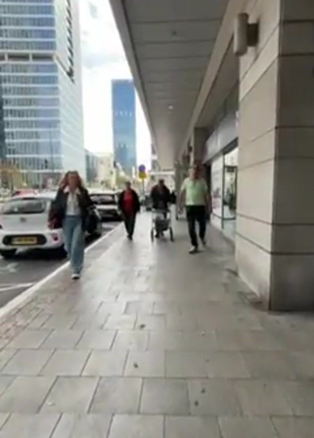 The camera films a sidewalk on a city street, capturing several pedestrians walking by