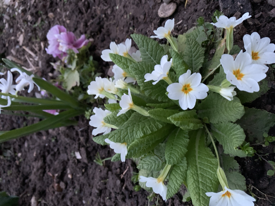 A close-up image depicts a garden bed in Lehchevo, Bulgaria. The central subject is a cluster of white primrose flowers (Primula vulgaris) with pronounced yellow-orange centers, surrounded by dark green, textured leaves. These plants emerge from dark brown soil that occupies the foreground and midground. In the blurred background, several white multi-floret flowers on green stalks are visible towards the upper left, while a diffuse purple flower appears further back to the right. The soil contains minimal organic debris and small, scattered stones. No people or animals are present.