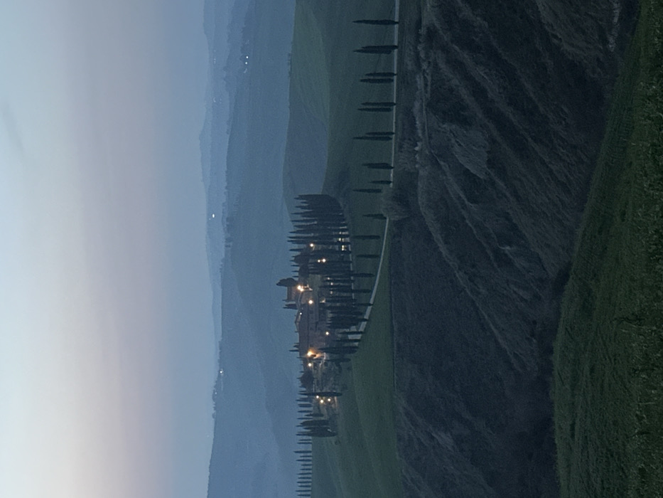 This image depicts the Agriturismo Baccoleno complex, located near Asciano in the Crete Senesi region of Tuscany, Italy. The scene is captured during a period of low natural light, likely dusk or dawn, under a pale blue-grey sky. A cluster of traditional Italian farmhouse buildings, illuminated by multiple warm yellow artificial lights, occupies a hilltop in the middle ground. A prominent, winding road, bordered densely by tall, slender cypress trees, ascends towards and partially encircles the illuminated complex. The foreground features a steep, dark, vegetated embankment. The broader environment consists of undulating green hills, with multiple layers receding into a hazy distance. No human figures or active subjects are present.
