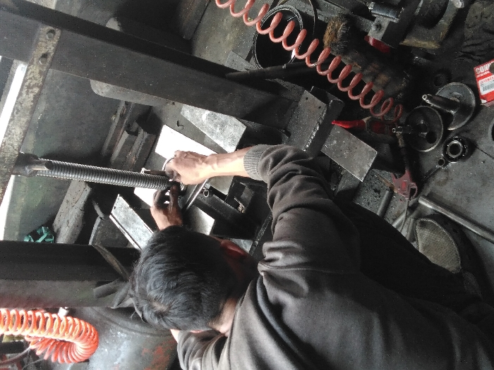 This image depicts a workshop scene in Elst, Netherlands, with a single individual actively engaged in mechanical work. The person, viewed from behind, is wearing a dark grey hooded sweatshirt with ribbed cuffs and dark trousers. Their hands, appearing soiled from work, are manipulating a small metal component beneath a large vertical threaded screw mechanism, which is part of a heavy-duty press or similar industrial machine. A wrench-like tool is held in the individual's left hand, working on the component positioned on a light-colored metal plate that rests on the machine's base. The environment is industrial and cluttered. To the left, a large orange coiled air hose extends from an unseen source. To the right, another orange coiled hose is visible among various disassembled metal components, including bearings and conical parts, suggesting automotive or engine repair. A red plastic bottle, a black container, and a red-and-white cardboard box, possibly containing a new part, are also on the floor or workbench. The floor appears to be concrete, scattered with debris and additional tools, indicating an active workspace.