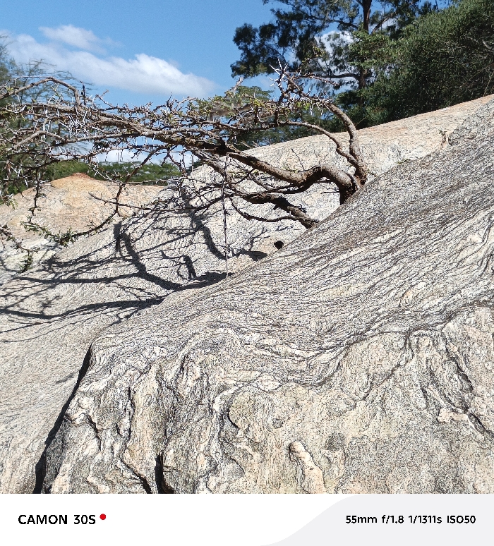 A rocky landscape under a blue sky, featuring a gnarled tree growing on the surface. The stone is textured with light and dark striations, creating a patterned effect. The tree's branches cast sharp shadows on the rock. Lush green vegetation appears in the background, adding depth to the scene. A second rock formation lies in the left background. The image appears to be taken on a sunny day.