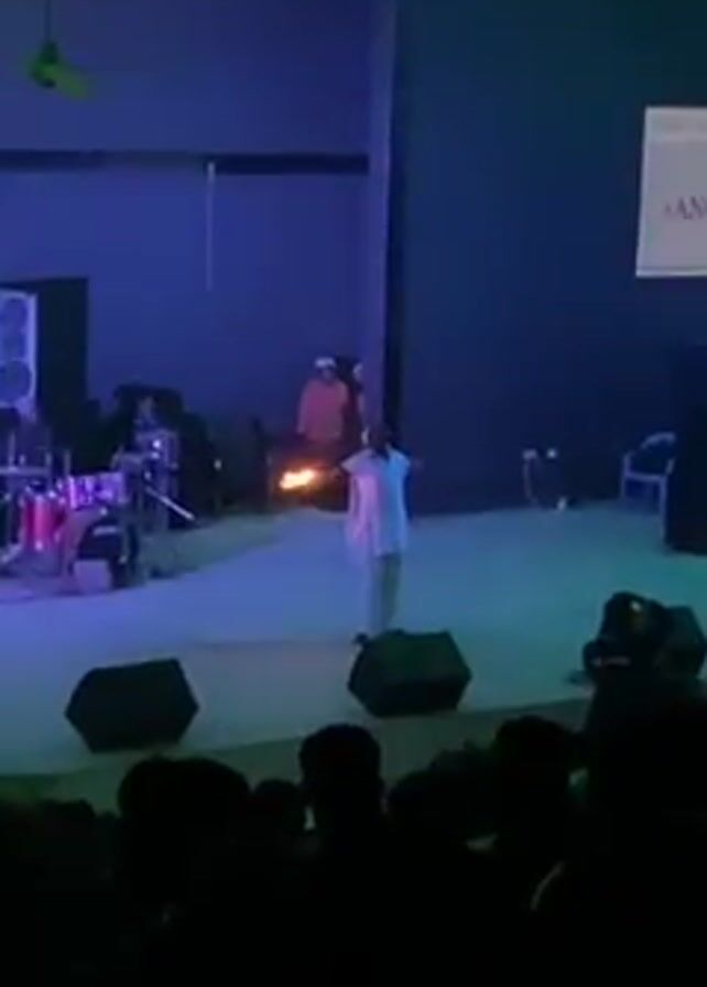 A person in white clothing stands on a stage, holding a flaming torch in their right hand, arm raised, as they face a crowd of people. The stage also contains several speakers, a drum set, and band equipment, illuminated with stage lights in blue, orange, and purple tones. A projection screen shows text in the upper right corner. The crowd appears captivated, with a raised hand and a peace sign visible.