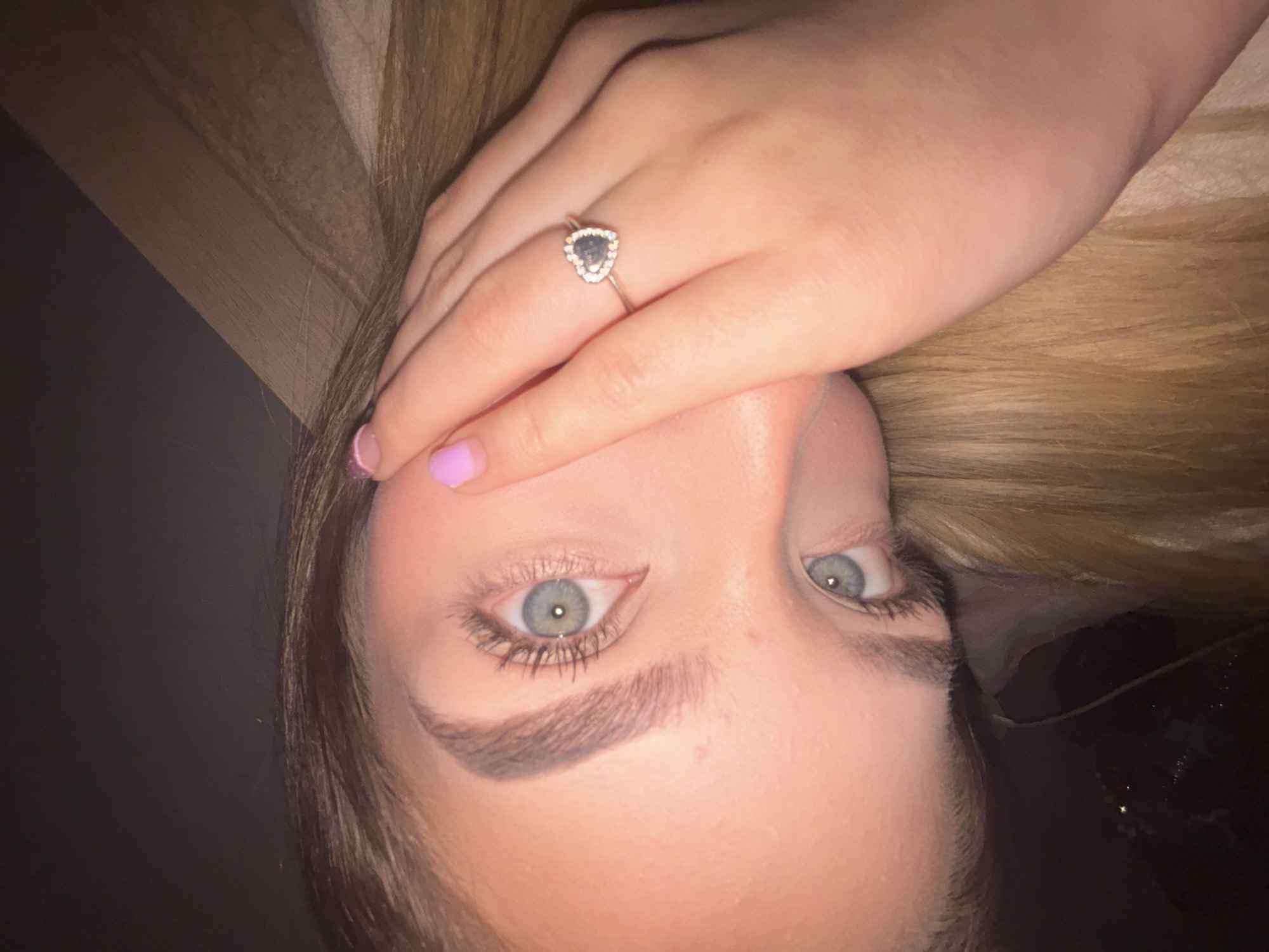 The image is a close-up portrait, oriented 90 degrees counter-clockwise, depicting the upper face and left hand of an individual. The subject has fair skin, light blue-grey eyes with dark eyelashes, and visible eyebrows. A left hand, with fingernails painted a pale lavender, covers the lower facial region. A silver-toned ring featuring a heart-shaped dark stone surrounded by small clear stones is present on the ring finger of the left hand. Light brown or blonde hair is visible along the side of the face. The background consists of a dark, indistinct surface and a light brown, textured wooden surface. The image does not contain discernible visual information to specify a location within Yambol, Bulgaria.