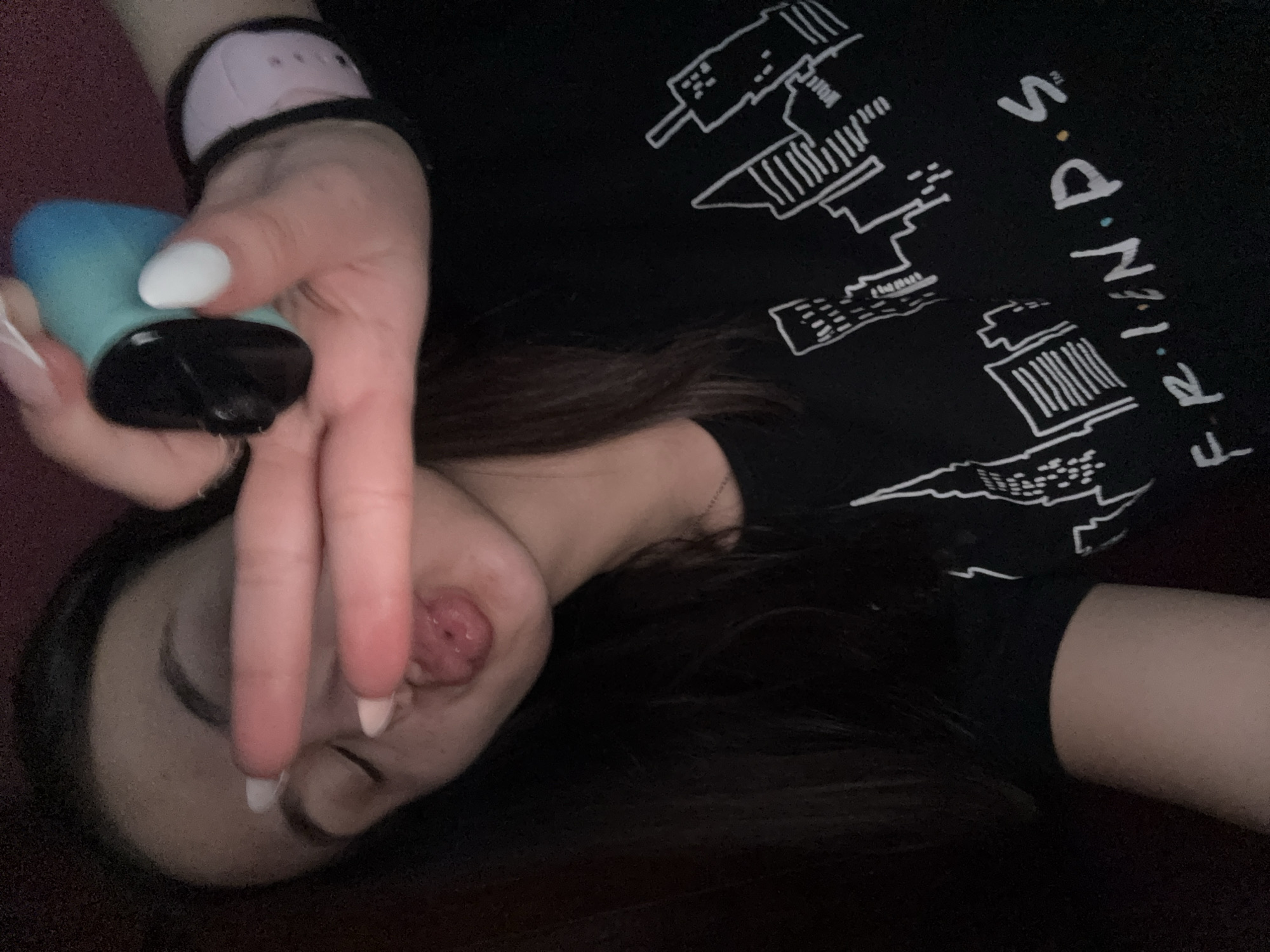 A person is reclined with their head at the bottom left of the frame, and their torso extending towards the upper right. They are wearing a black t-shirt with a white line drawing of buildings and the word "F.R.I.E.N.D.S." visible on the right side. The person is holding a blue vaping device with a black mouthpiece in their left hand near their face. They have long, dark hair. The location is not discernible from the image.