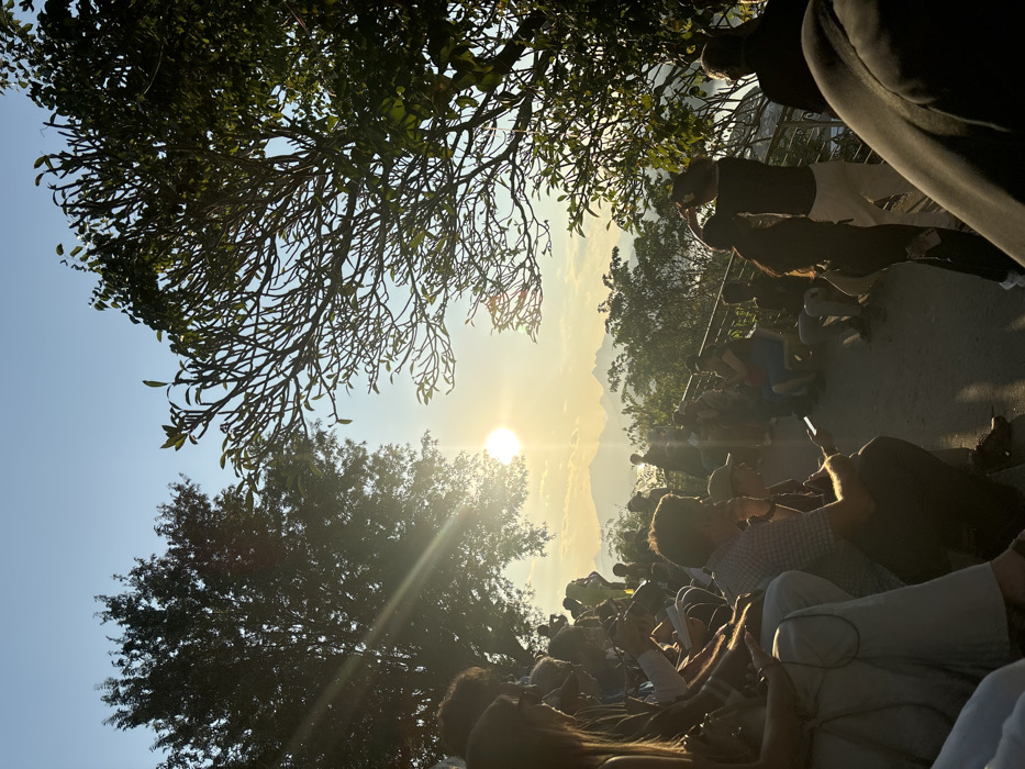 This image depicts an elevated outdoor viewing platform in Houaxieng, Laos, during sunset. Approximately 40-50 individuals are gathered, primarily facing west towards the prominent setting sun, which is a bright orb in the upper-center, casting strong golden light and visible lens flare. The background reveals a range of distant mountains and a body of water beneath a clear sky with scattered clouds near the horizon. Two large trees frame the upper portion of the scene: one on the left with dense, dark foliage, and another on the right exhibiting intricate, bare branches with sparse leaves. The foreground and midground comprise a paved or stepped surface where the crowd is positioned. Many individuals are either seated or standing, with several holding mobile phones, suggesting photography or video recording. A man wearing a checkered shirt is visible in the mid-left, observing a mobile device. On the mid-right, a metal railing delineates the platform's edge, near which two individuals are standing; one appears to be adjusting their headwear. The scene captures a concentrated assembly observing a natural event.