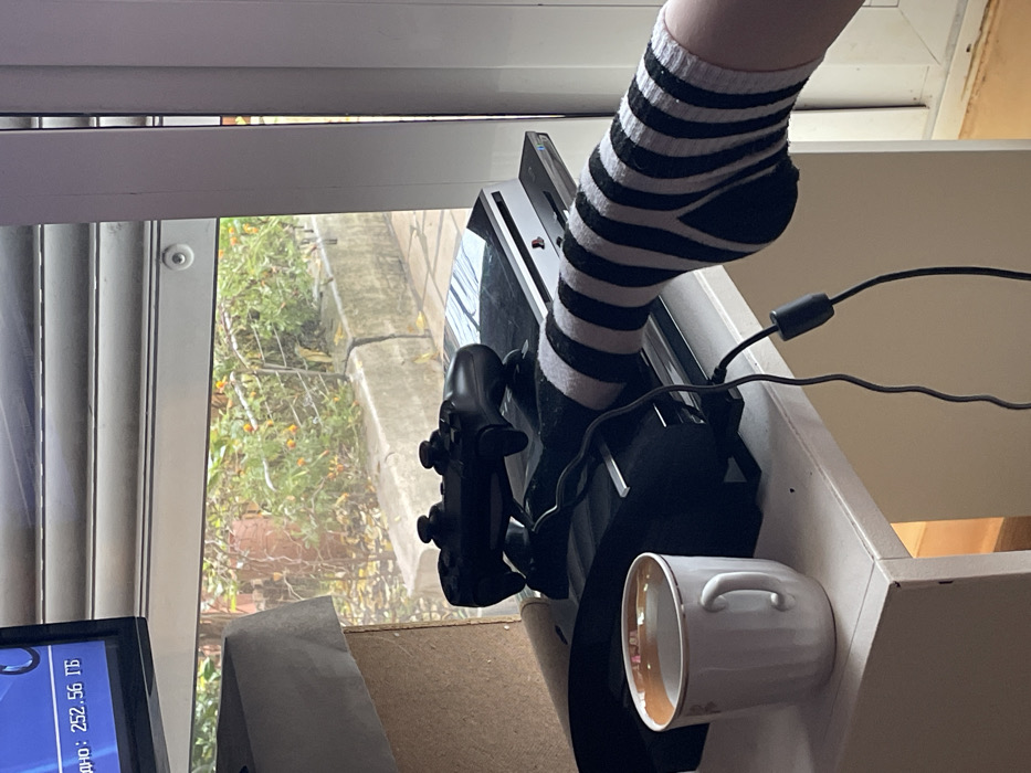 An indoor scene in Budva, Montenegro, depicts a partial view of a room with a window looking outdoors. In the foreground, a white table or shelf holds a white ceramic mug with an orange interior rim on the left. To the right, a black PlayStation console (likely a PS3 Super Slim or early PS4 model) is positioned horizontally, with a black DualShock controller resting on its top surface. A human left foot, covered by a black and white horizontally striped sock, is propped on the right side of the console. Black cables, one with a ferrite bead, are visible near the console and foot. In the upper left quadrant, a television screen is partially visible, displaying Cyrillic text indicating "252.56 GB". The background, visible through a partially raised window equipped with metal roller shutters, shows an outdoor area with green foliage, a concrete curb, and a paved surface.