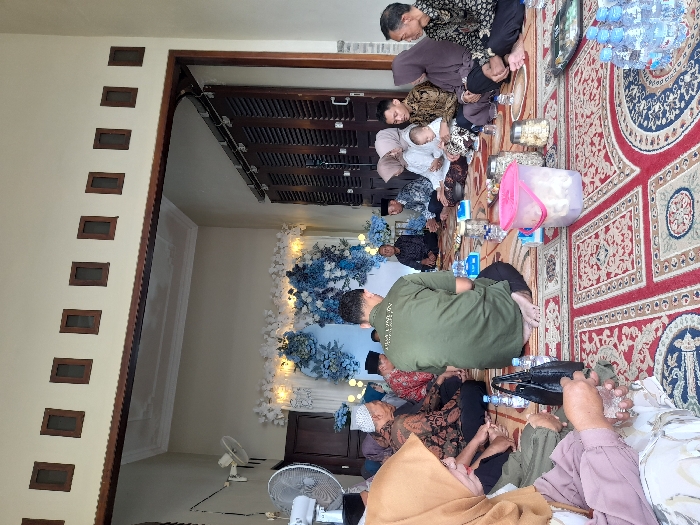 A group of people are gathered on a patterned red rug, seemingly in a formal or celebratory setting. They are seated on the floor, some with drinks and food items nearby. In the background, there's a decorative floral arrangement in shades of blue and white. The room appears to be indoors with a wall featuring small square openings near the ceiling. A ceiling fan is visible in the background.