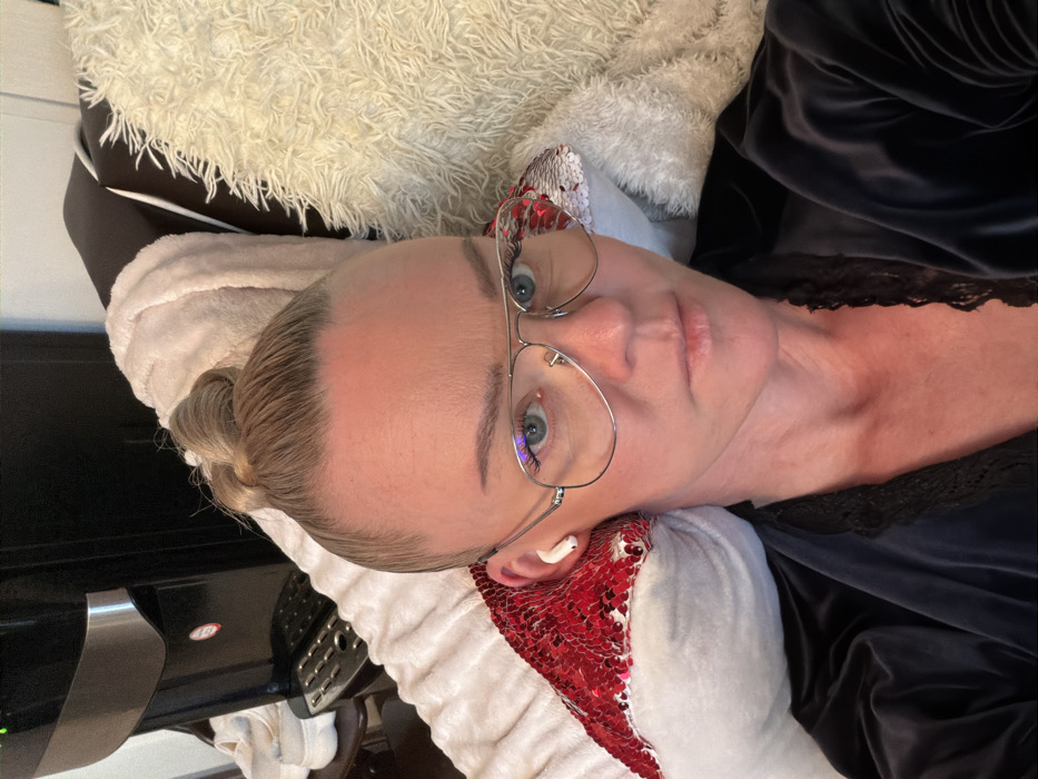 The image displays an adult female subject in a residential interior setting within Vsevolozhsk, Russia. The subject is positioned centrally, reclining, and looking directly at the camera. Her hair is blonde, pulled into a high bun. She wears silver-framed aviator-style eyeglasses and a white wireless earbud in her left ear. Her attire consists of a dark velvet robe with black lace detailing along the collar. She is supported by a white pillow featuring red, reflective sequins on her left side, and an off-white shaggy or faux fur pillow on her right. In the background, to the upper left, a dark-colored appliance resembling a water cooler with a silver dispenser and control panel is visible, alongside white athletic shoes and a dark object consistent with a keyboard. To the upper right, a section of dark furniture, likely an armrest or backrest, is partially visible behind the shaggy pillow.