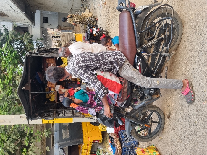 This image depicts a bustling street scene in Brahmanapalle, India, centered around a mobile roadside market stall. In the midground, an elderly male vendor with a white beard and white prayer cap operates a stall constructed on a three-wheeled utility vehicle, selling bananas and various packaged goods. He is seen attending to customers; a woman in a purple sari with a green blouse and orange flowers in her hair stands to the left, and an older man in a white shirt stands to the right, both facing the vendor. In the foreground, a male individual wearing a plaid shirt, light-colored pants, and pink and dark grey clogs is seated on a black Bajaj CT 125X motorcycle, facing left. A red and white bag is draped over his left shoulder. To the right of the motorcycle's rear wheel, a small child in a blue top is partially visible. To the left of the market stall, the rear portion of a yellow three-wheeled auto-rickshaw or utility vehicle is visible. Below it, blue plastic crates and a yellow and green bag are on the ground. A yellow utility pole with "SS19" and "2" markings stands prominently on the left. In the background, to the right, another person in a patterned sari is walking away from the main activity area, near a dark-colored motorcycle parked on a dirt path leading to concrete buildings, one of which appears unfinished. Overhead, green foliage from trees is visible, indicating an outdoor setting. The immediate ground surface is paved road.
