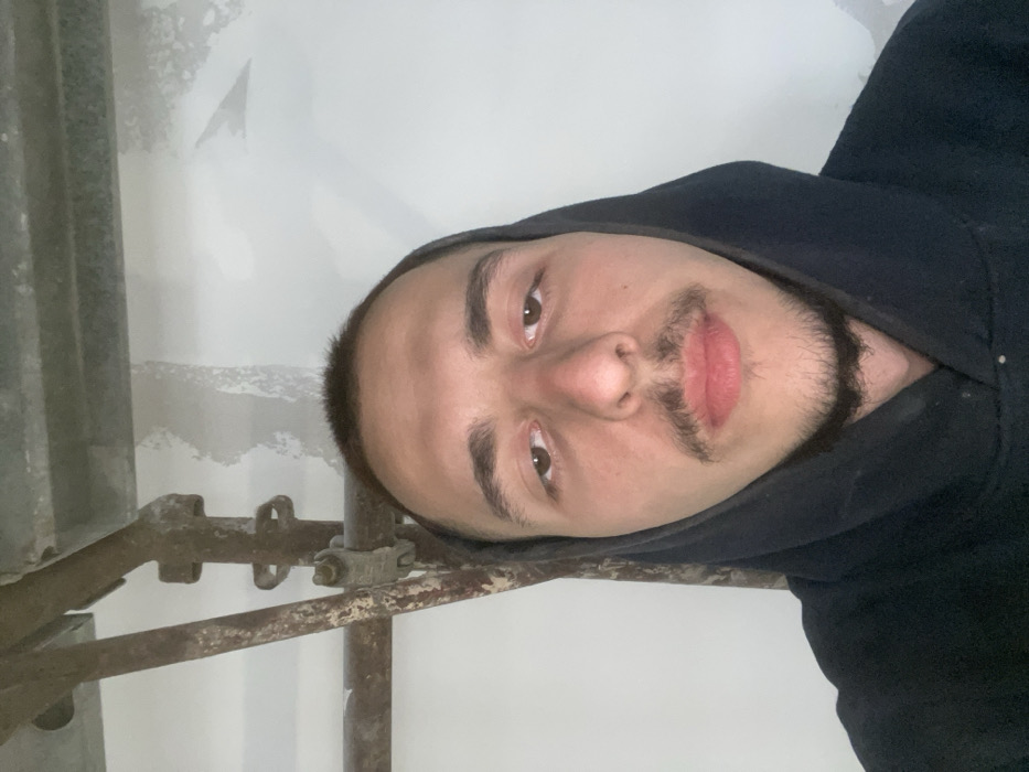 The image displays a close-up portrait of a single male individual, framed from the mid-chest upwards. The subject, appearing to be in their 20s or early 30s, possesses a medium skin tone, short dark hair, dark brown eyes, and a mustache with a short beard. He is wearing a black hooded sweatshirt with the hood up, looking directly at the camera with a neutral expression. To the left and behind the individual, a section of rusted metal scaffolding or a similar structural element, composed of interconnected bars and clamps, is visible. The background consists of a light-colored wall exhibiting areas of discolored or peeling paint/plaster, with a darker horizontal structural element positioned at the top of the frame. The scene is situated in Gavril Genovo, Bulgaria.