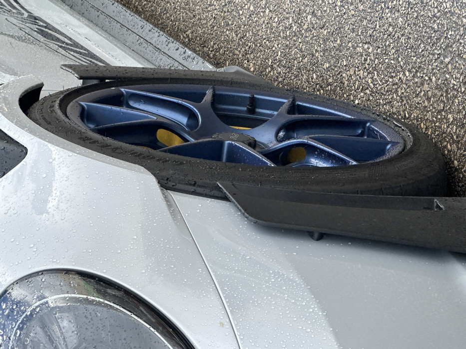 - "The image displays a close-up, angled view of the front passenger side of a light grey or silver vehicle, likely a high-performance sports car, situated on a dark grey asphalt surface" by FM-EXOi83, licensed under CC BY 4.0