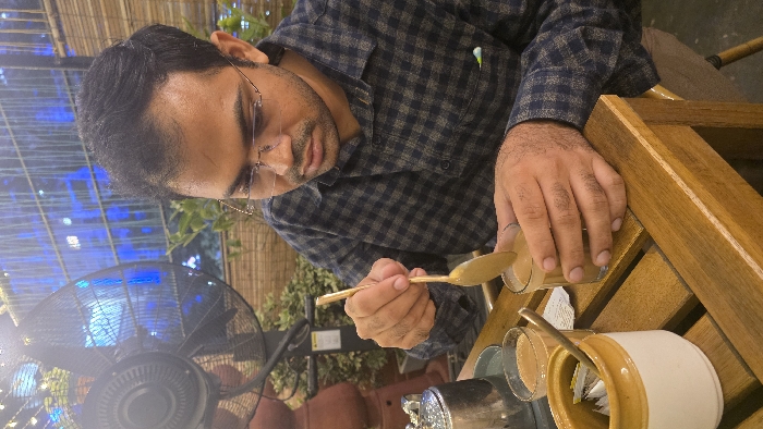 A male individual, appearing to be of South Asian descent, is seated at a slatted wooden table in an establishment in Kolkata, India