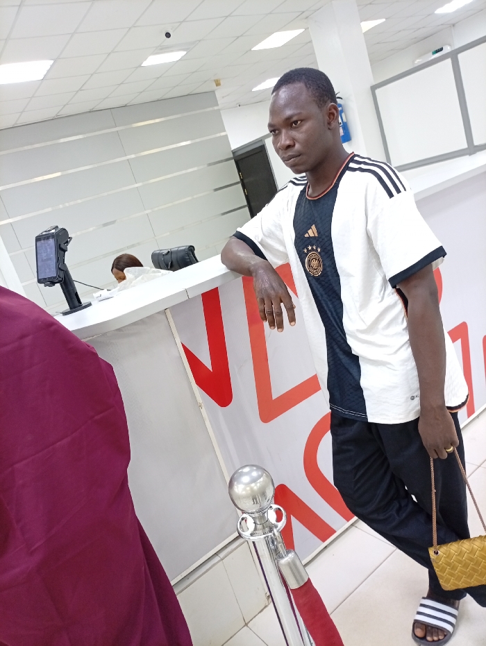 The image depicts an indoor scene, likely a service center or bank, located in Zaria, Nigeria. A male individual, appearing to be of African descent, stands prominently in the right half of the frame. He wears a white and black Adidas Germany football jersey, dark athletic pants, and white and black striped slide sandals. His right forearm rests on a white counter, and he holds a small, woven, golden-yellow clutch bag in his left hand. A ring is visible on his right ring finger. His gaze is directed off-camera to his left. Behind the white counter, a second individual with brown hair is partially visible, facing away from the camera. Objects on the counter include a black point-of-sale (POS) terminal on a stand and a black bag. The front face of the counter displays large, partially obscured red lettering. The background features white walls with horizontal gray striping, a dark doorway, and a white rectangular board or screen on the far right wall. A blue fire extinguisher is mounted on the wall near the board. The ceiling is white, composed of square tiles with recessed lighting fixtures, and a small black security camera is visible. In the lower left foreground, a silver stanchion with an attached red velvet rope is present, with a large section of burgundy fabric partially obscuring the left side of the frame.