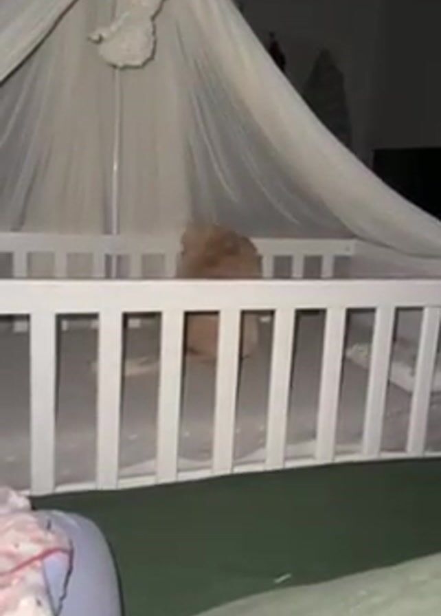 medium-sized, tan-colored cat sitting in a white crib with a white canopy. The crib is in a room that appears to be a bedroom, with a television visible in the background, and green bedding and pillows in the foreground. The cat is sitting upright and looking to the left, with its tail visible. The crib has a white rail on all sides. The room is somewhat dimly lit.