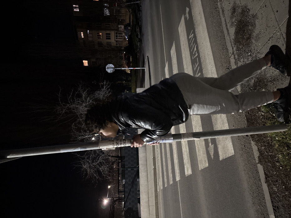 At night in Radomir, Bulgaria, an individual with dark, curly hair is seen in profile, leaning against a tall, grey metal utility pole. The person wears a black puffer jacket, light grey sweatpants, and dark athletic shoes, with an earring visible in the left ear, and is looking upwards and to the left. The left hand grasps the pole, which is affixed with several torn white posters or flyers. The pole stands on a small patch of grass adjacent to a paved sidewalk. Immediately in front of the pole is a marked pedestrian crosswalk with white stripes on dark asphalt, displaying partially visible Cyrillic text, "ИЛЕЗНИ," and an arrow pointing left. In the background, a street runs parallel to the sidewalk, and distant streetlights illuminate parts of an urban environment. Several bare trees are visible, and multi-story residential buildings with illuminated windows are present on the right side of the image, beneath a dark night sky. Other street signs are visible further down the road.