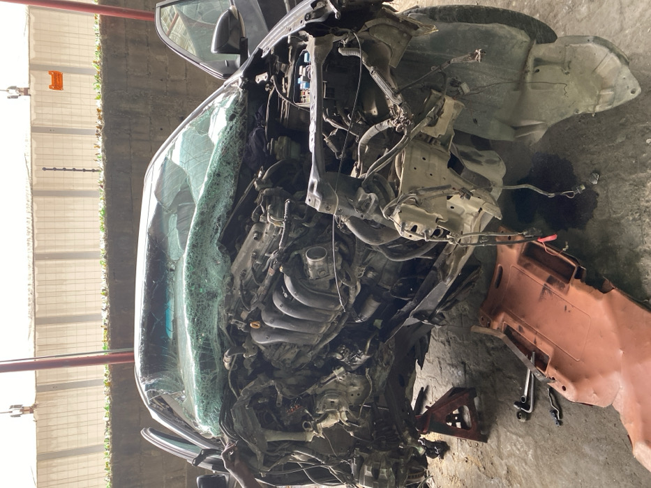 The scene depicts a severely damaged dark-colored sedan, likely a result of a frontal collision, situated within a workshop or garage in Igboefon, Nigeria