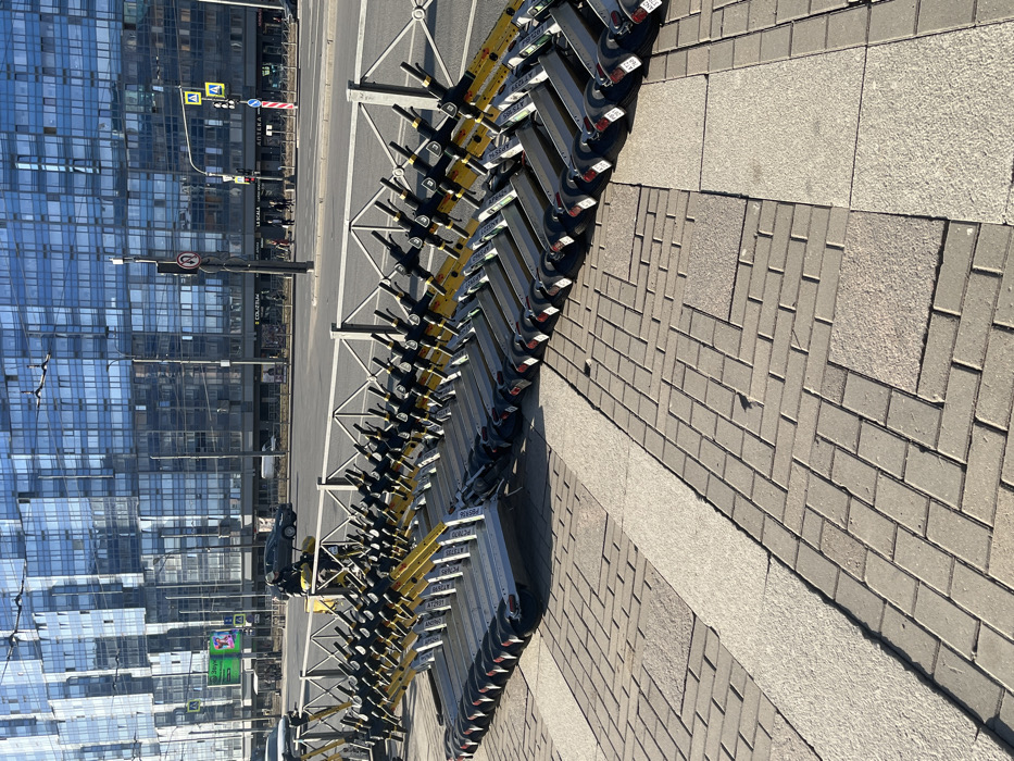 The image displays an urban street scene on Korablestroiteley Street in Saint Petersburg, Russia, under clear daylight conditions. In the foreground, approximately 40-50 electric scooters are systematically arranged in multiple rows on a paved sidewalk composed of light grey rectangular and square pavers. The scooters exhibit two main color schemes: predominantly grey/silver with black components, and several units featuring yellow frames. A low metal pedestrian barrier separates the sidewalk from a multi-lane asphalt road. On the left side of the scooter formation, a single individual, wearing a light-colored jacket and dark headwear, is positioned on a yellow electric scooter, facing away from the viewer, appearing to interact with the grouped scooters. On the road, traffic is observed, including a dark-colored sedan and a white van. Across the road, several pedestrians are visible on the opposite sidewalk. The background features a large, modern multi-story building characterized by its blue reflective glass facade. Numerous street elements are present, including lampposts, traffic lights, a "No U-turn" sign, a pedestrian crossing sign, and a large green digital advertising board.