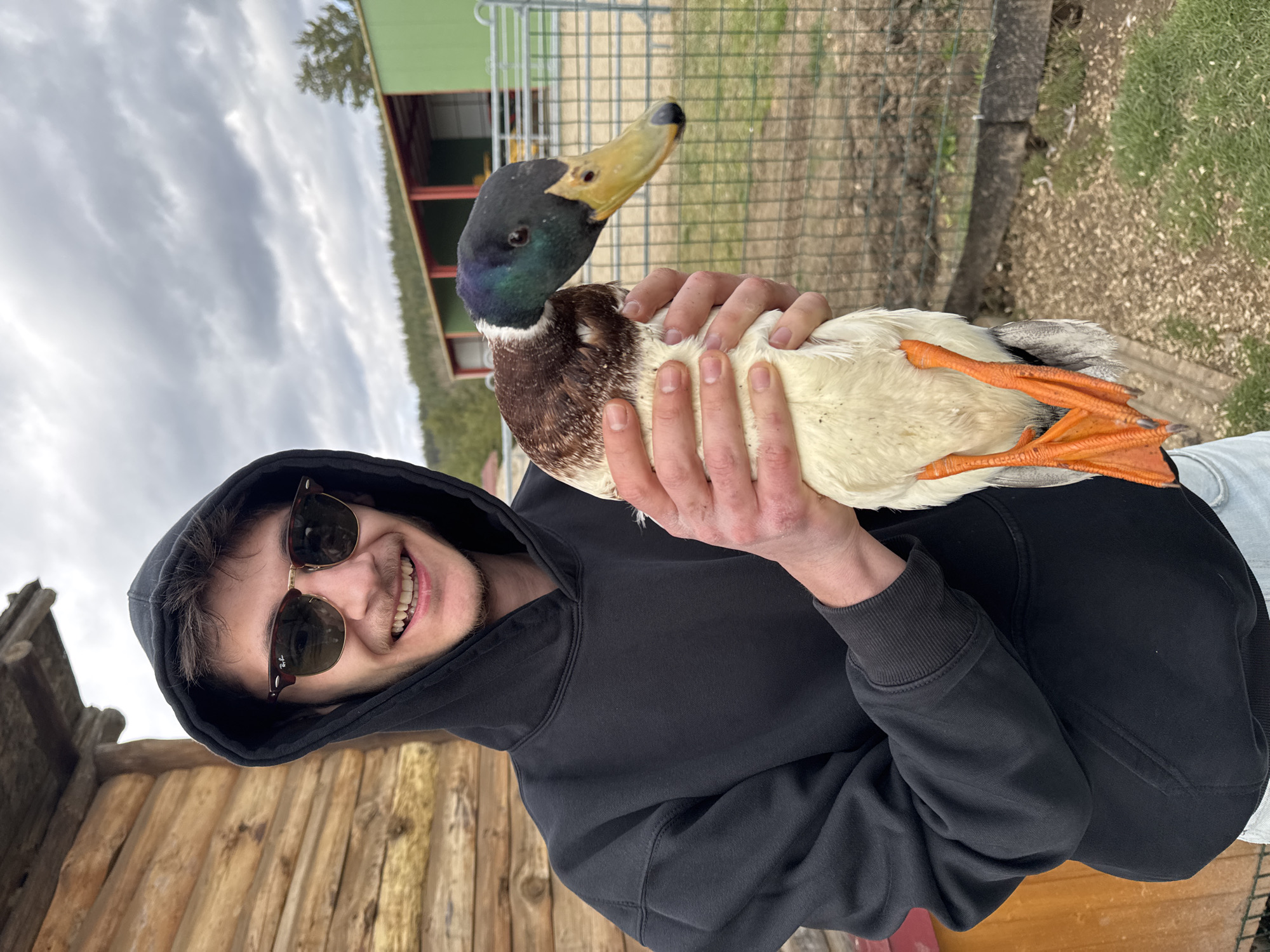 A man wearing a black hoodie and sunglasses is holding a duck. The duck has a black head with iridescent green feathers, a yellow beak, brown chest feathers, and white belly feathers. The duck's orange feet are visible. The man is smiling. The background includes a wooden structure, a green building with a red roof, a wire fence, and grassy ground. The sky is overcast. This image was taken near Kovachevtsi, Bulgaria.