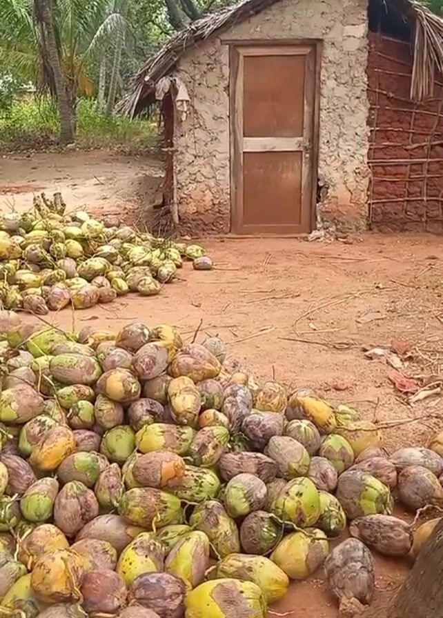 The video displays a rural scene. A small, possibly old, building sits with a weathered wooden door and walls composed of a mix of stone, brick, and clay. A thatched roof covers the building. In the foreground, a large pile of coconuts rests on the reddish-brown ground. Some are green, while others show hints of brown and yellow. Further into the background, additional coconuts are scattered across the ground. Trees and vegetation are visible in the distance, suggesting a tropical or semi-tropical environment.