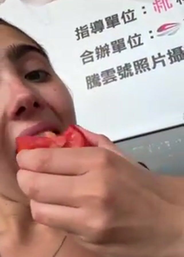 A woman eats a tomato in a selfie video. She has dark hair and eyebrows, light eyes, and is wearing a silver necklace. She bites off a chunk of a bright red tomato and chews. A poster is behind her with text written in Chinese. The top of a picture of a military tank is visible.