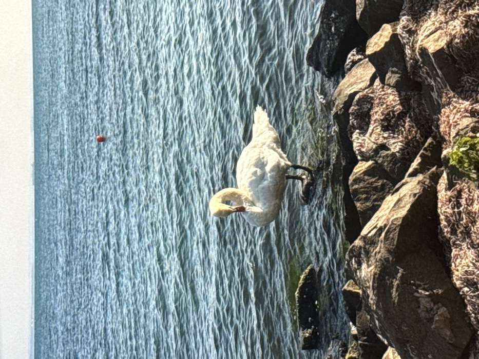 - "A white mute swan stands partially submerged in the rippled blue-green water on a dark, moss-covered rock" by FM-IPbBN2, licensed under CC BY 4.0