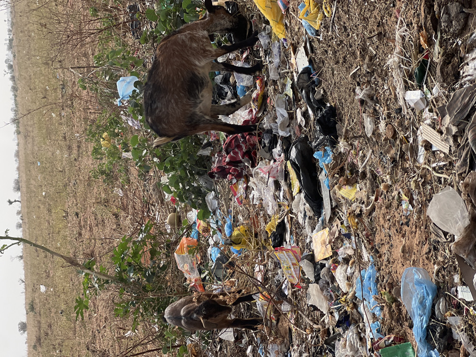 A desolate landscape is marred by scattered trash and debris. Two goats stand amidst the waste. The ground is covered in plastic bags, food wrappers, and discarded materials. Beyond the littered area, a barren field stretches into the distance. The scene conveys environmental degradation and its impact on animal life.