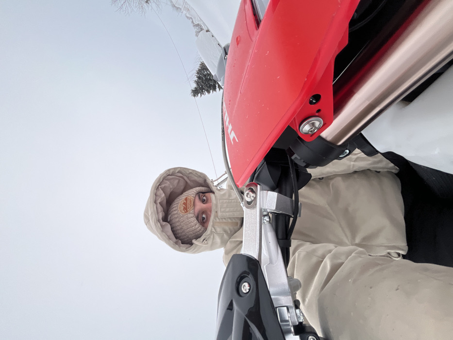A single individual is observed in a close-up, slightly low-angle perspective, positioned on what appears to be an off-road motorcycle or snowmobile in Vasilyevo, Russia. The person is heavily bundled in winter clothing, wearing a beige padded hooded jacket with the hood drawn up. A light brown knitted beanie, featuring an embroidered patch with a mountain logo and text, is visible beneath the hood. Only the individual's eyes and the bridge of their nose are discernible, peering directly forward. The foreground is dominated by elements of the vehicle. A red front fender, displaying partially visible white lettering that appears to read "THC" or "THE", occupies the right side. To the left, a black handguard and a silver-colored brake or clutch lever assembly are clearly visible on the handlebars, with associated cables. A portion of a chrome or metallic fork leg extends beneath the red fender. The vehicle also exhibits a white section, possibly a front cowl or number plate, below the red fender. The outdoor environment is characterized by heavy snow cover. The ground and distant elevated terrain, visible in the upper right background, are uniformly white with snow. Sparse, snow-dusted vegetation, including an evergreen tree, is present in the background. The sky is overcast and a pale gray, suggesting a winter day.