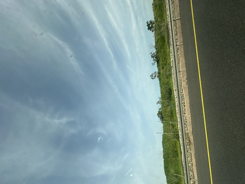 The image displays a roadside scene, likely captured from a moving vehicle, with the horizon line positioned approximately one-third up from the bottom edge