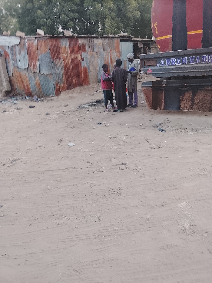 Three individuals stand on a dirt road next to a rusty corrugated metal fence and a large vehicle. One person wears a pink shirt and black pants, another a long black robe, and the third a light-colored outfit with a white cap. The vehicle appears to have the name "ABBAN KADIR" painted on it. The ground is uneven and scattered with debris. Trees are visible in the background.